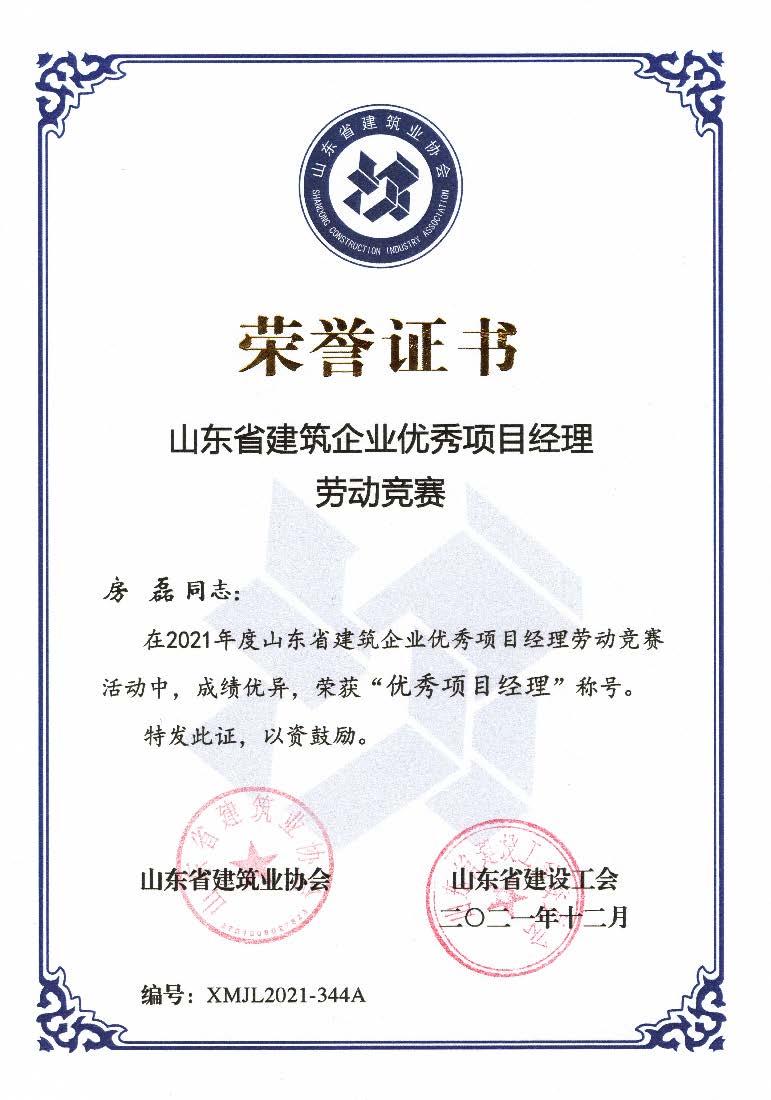 在山東省建筑業協會和山東省建設工會組織的2021年度山東省建筑企業優秀項目經理勞動競賽活動中,我公司王勇同志和房磊同志獲評山東省建筑企業“優秀項目經理”稱號。
